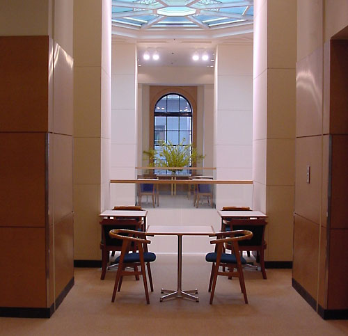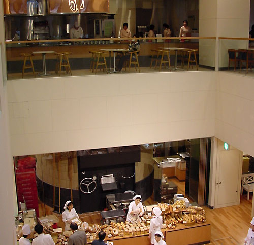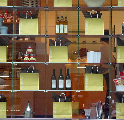 Two stories of food retail and marché including five food concepts and kitchens. Mixed mid-20th century Danish designs with elements of the store design 20 years earlier, including antiques from Denmark.