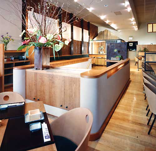 Arranged as a traditional western bistro with bench seats at both long walls with materials and a sensibility that is Japanese