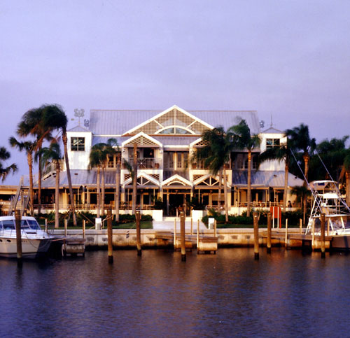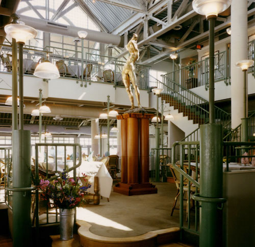 A 350-seat, multiple-leveled, indoor/outdoor seafood restaurant with a timeless structure that appears to be an ancient factory, scraped clean and painted with a restaurant built within large French doors and clerestories provide a tent like open feeling even within its air conditioned interiors.